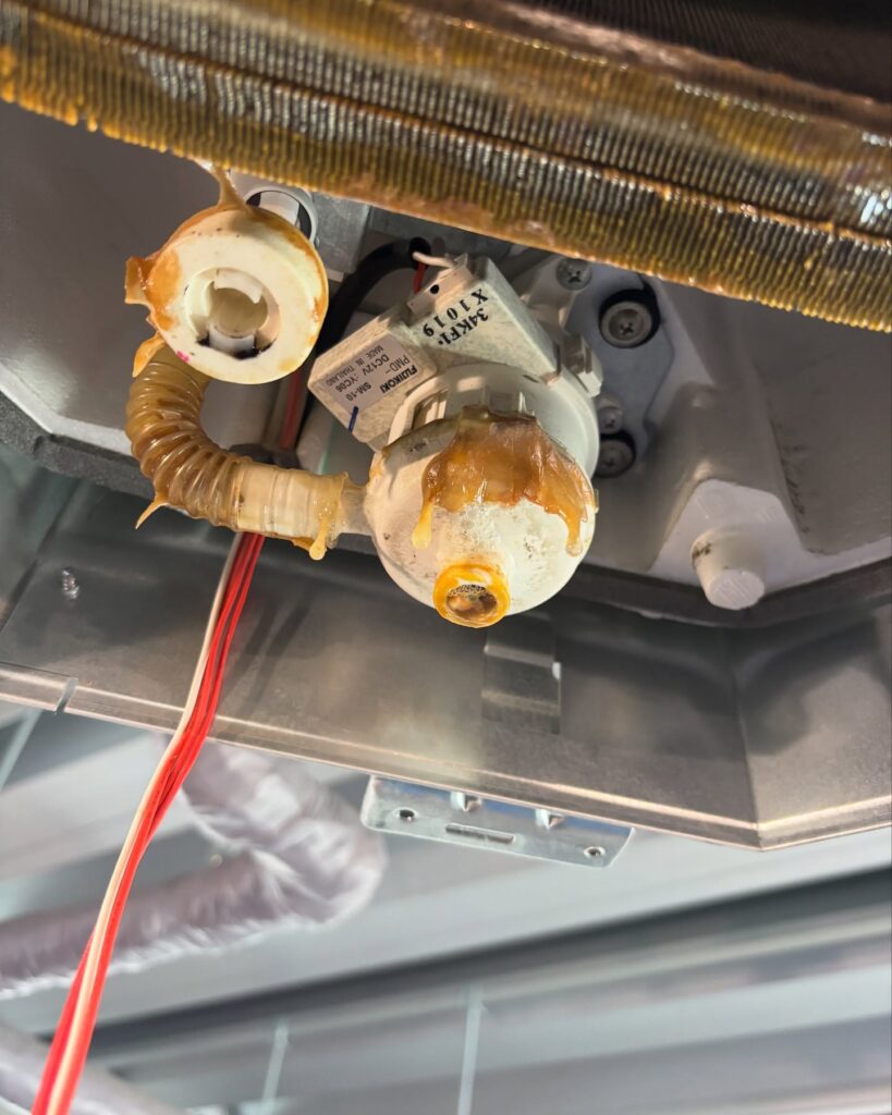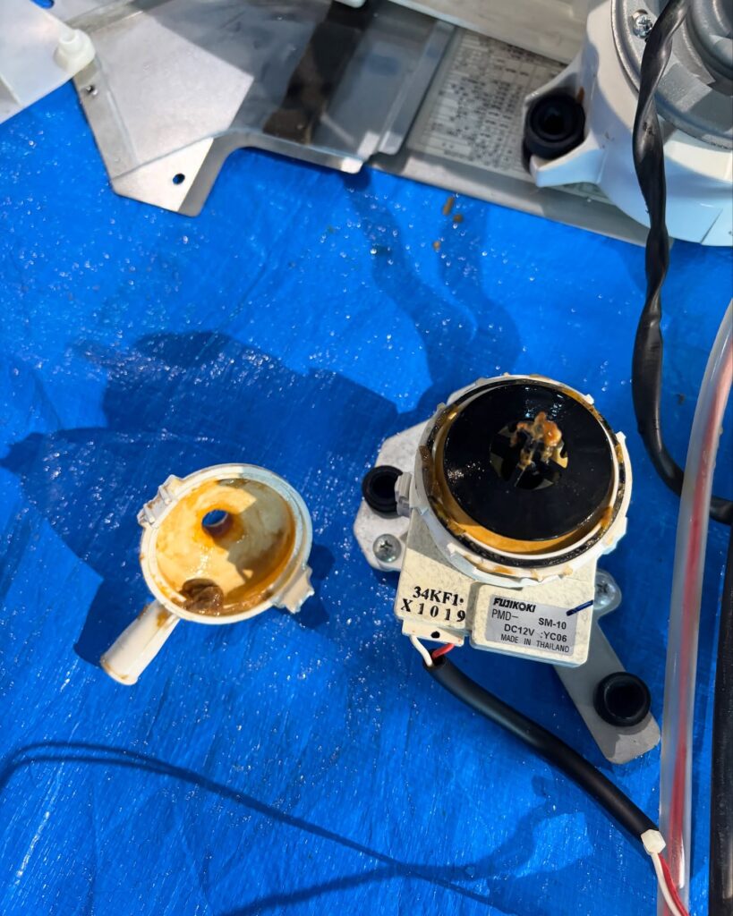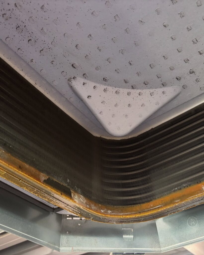 夏場に業務用エアコンで発生するエラー停止のほとんどは、ドレンパン(結露水の受け皿)に溜まった水がカビにより固形化し、それを吸い上げたドレンポンプ・ドレンホースが詰まることによるものです。