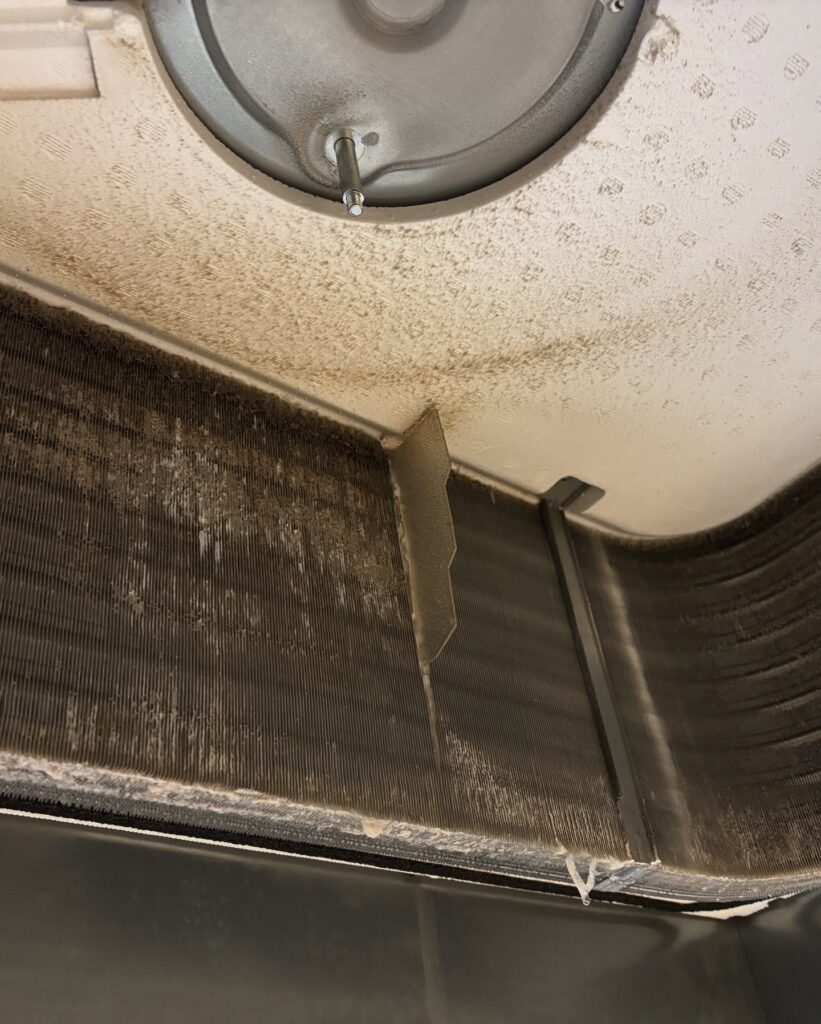 夏場に業務用エアコンで発生するエラー停止のほとんどは、ドレンパン(結露水の受け皿)に溜まった水がカビにより固形化し、それを吸い上げたドレンポンプ・ドレンホースが詰まることによるものです。