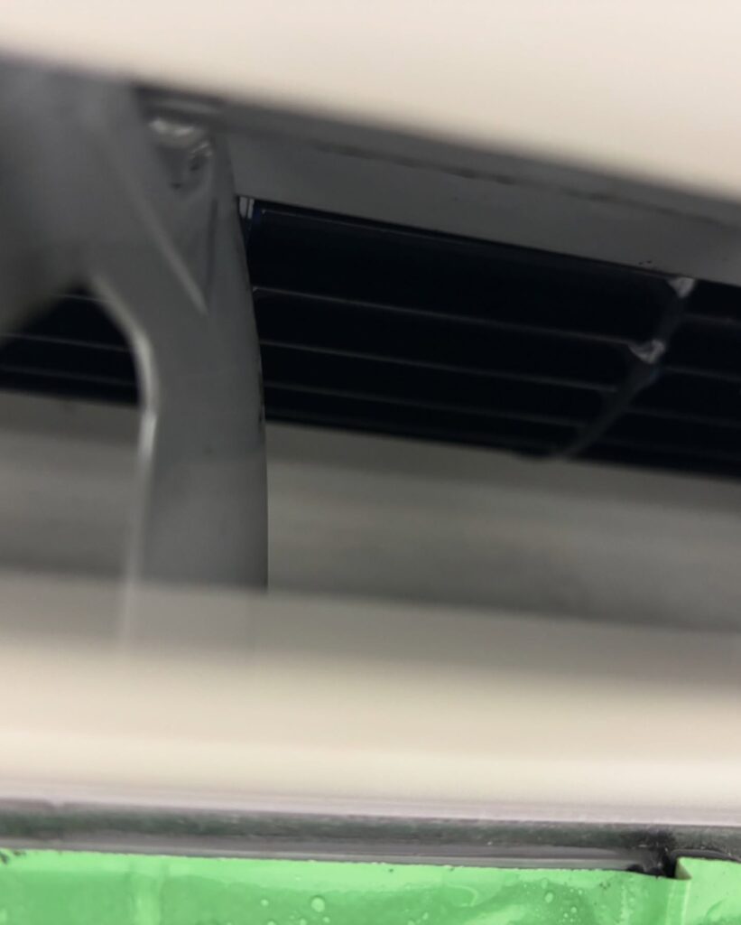 エアコン内部と取り外したパーツにエアコンクリーニング用洗剤を噴霧し、高圧洗浄により汚れを取り除いていきます。