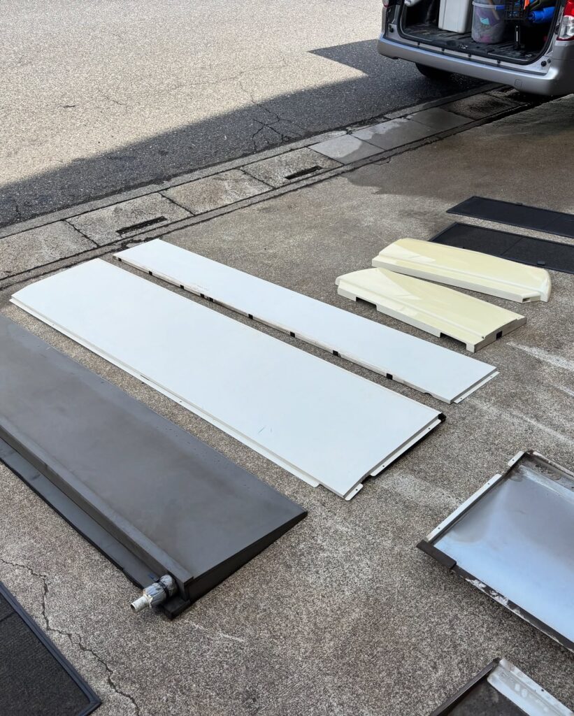 エアコン内部と取り外したパーツにエアコンクリーニング用洗剤を噴霧し、高圧洗浄により汚れを取り除いていきます。