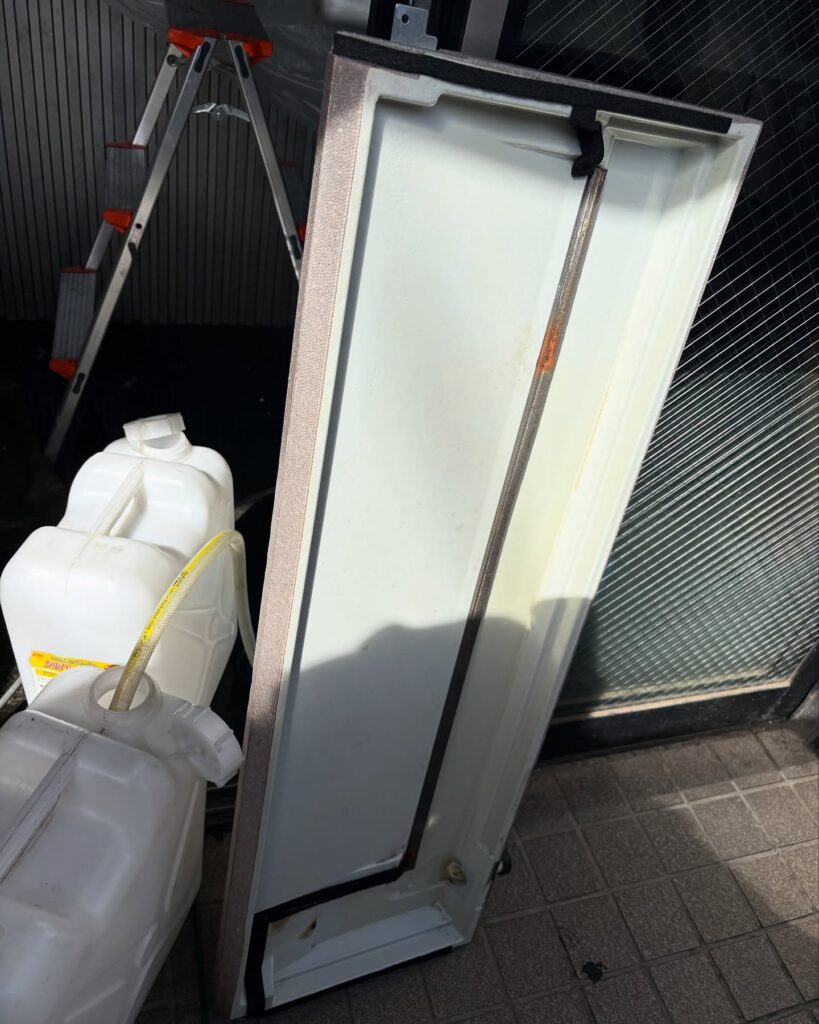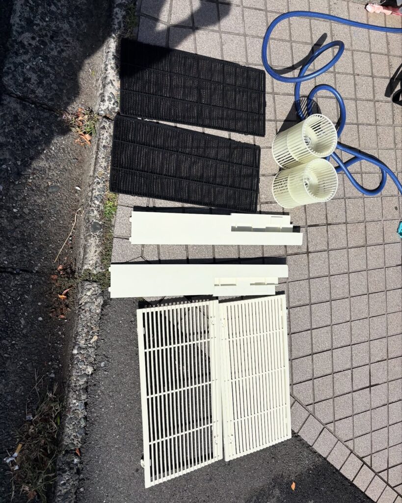 エアコン内部と取り外したパーツにエアコンクリーニング用洗剤を噴霧し、高圧洗浄により汚れを取り除いていきます。