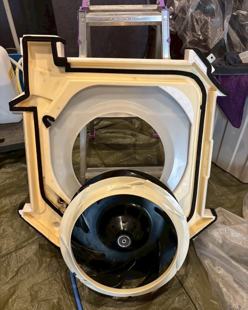 エアコン内部と取り外したパーツにエアコンクリーニング用洗剤を噴霧し、高圧洗浄により汚れを取り除いていきます。